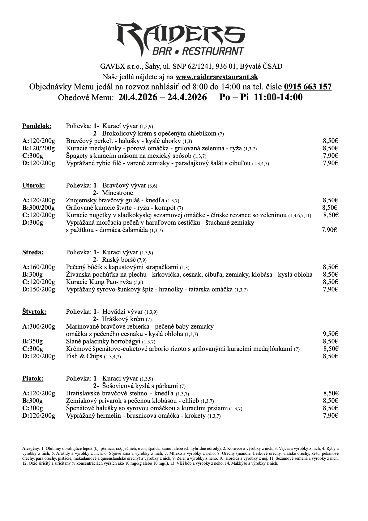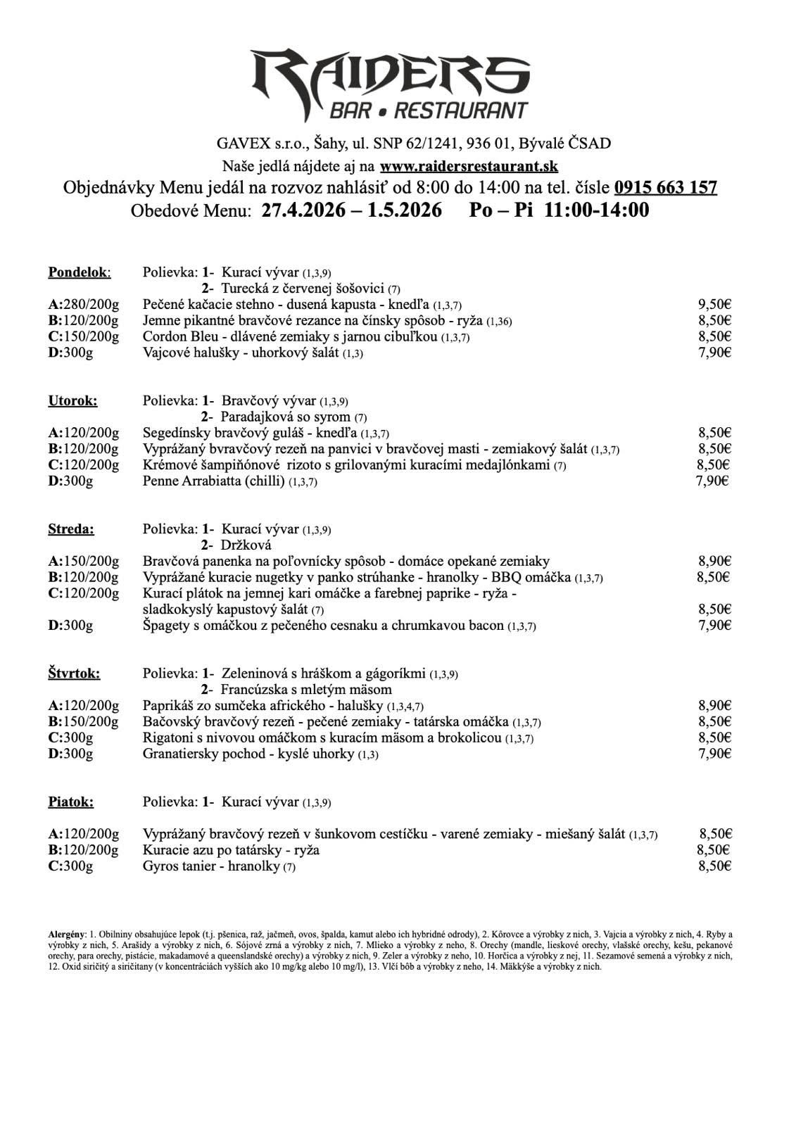Raiders reštaurácia bola zrekonštruovaná v roku 2014-2017 z bývalej administratívnej budovy ČSAD – ŠAHY. V príjemnom prostredí ponúkame široký výber hotových jedál ako aj obedové menu (polievka a hlavné jedlo), ktoré zhotovujeme podľa najnovších trendov modernej gastronómie! Výber z rôznych druhov jedál (mäsité, bezmäsité aj sladké špeciality) a lahodnú na dreve pečenú Pizzu a grissini za prijateľné ceny.